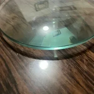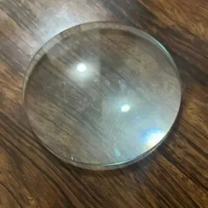 Clear round glass magnifying lens with a smooth surface.