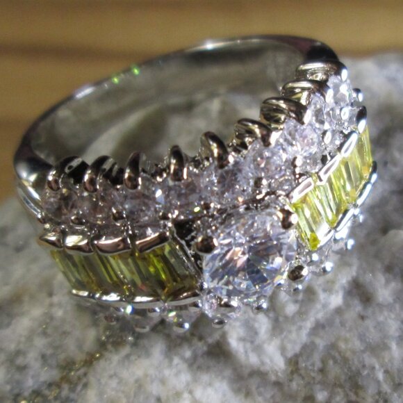 Clear Round and Lemon Baguette Stacked Ice cubic zirconia cocktail/statement ring. Simulates Diamond and Citrine. Silver plated metal alloy. Purchased 2008, never worn.