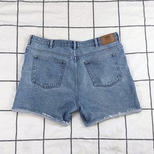 Light wash blue denim jeans shorts with a high waist and cut off hem! Has a route 66 patch on the back.