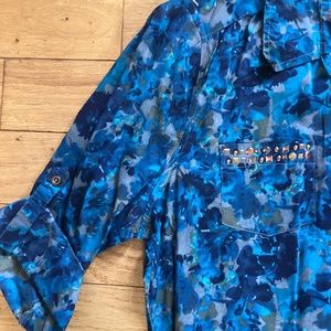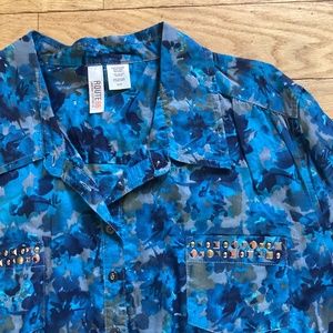 Route 66 short sleeve, quarter button blue print top with drawstring bottom