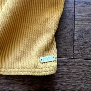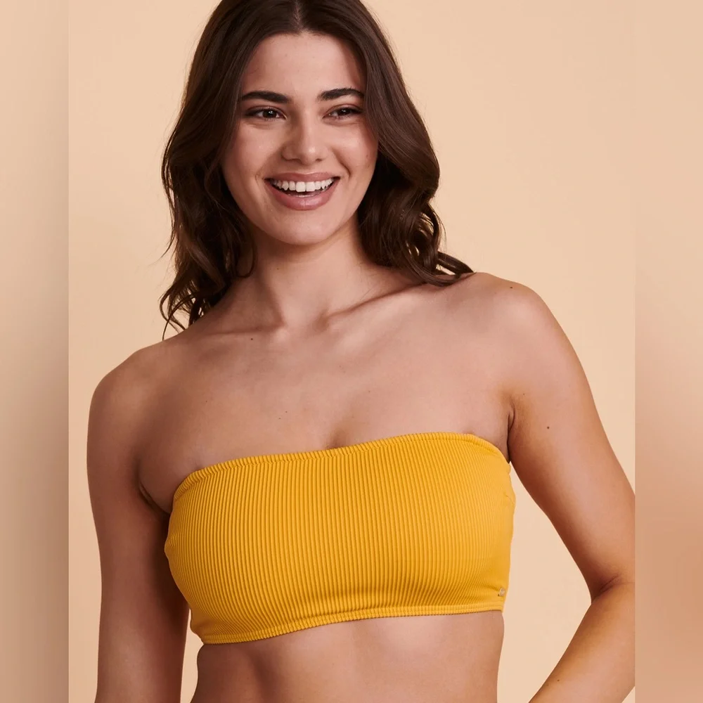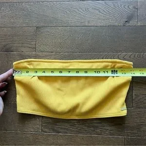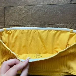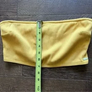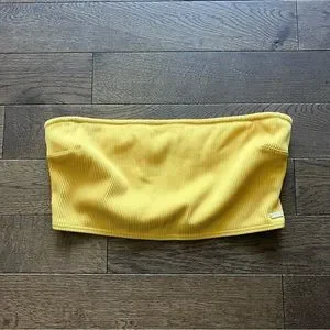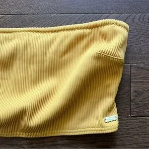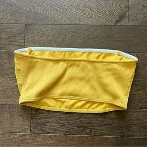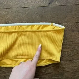 - Yellow strapless ribbed bikini top. Has a rubber strip along the inside to help prevent the top from falling down.