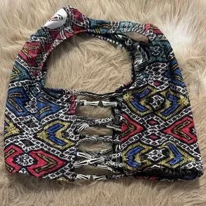 Roxy racerback tank with bold black and white geometric print. Stretchy, lightweight fabric. Scoop neckline and fitted silhouette. Casual and versatile for layering or warm days.