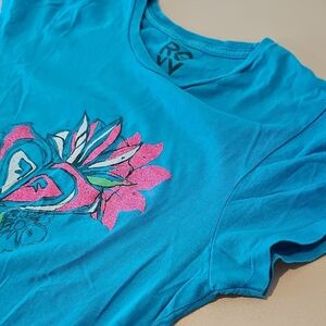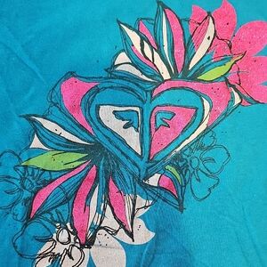 Stylish blue tee with bold pink floral design. Perfect for casual wear.