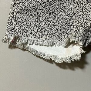 New condition! Cheetah print denim - tan base with black spots. Frayed leg opening. Zipper fly. Five pockets. Belt loops. Leather patch logo on back. Materials - cotton/ elastane blend. Measurements: Rise 7.5” Inseam 2.5” Lay Flat Waist 16”