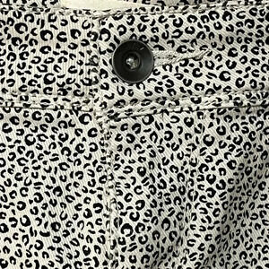 New condition! Cheetah print denim - tan base with black spots. Frayed leg opening. Zipper fly. Five pockets. Belt loops. Leather patch logo on back. Materials - cotton/ elastane blend. Measurements: Rise 7.5” Inseam 2.5” Lay Flat Waist 16”