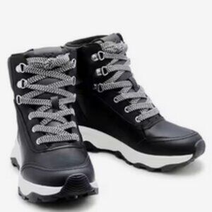 Complete your winter look with these waterproof, ankle boots by Roxy. Made of a durable faux leather upper, they feature D-rings and metal eyelets to allow an adjustable, perfect fit and a soft lining for comfort. The padded insole means comfortable insulation for those cold winter days while the lug sole gives you stability when you really need it. The heel measures 1.5 inches (3.81) high and the platform is about 1 inch (2.54 cm). I've worn these boots in a drenching downpour and, although I was comfortable, my feet felt a little damp by the time I returned home. They are advertised as waterproof, I would say they are more water resistant. Still, they are a great little boot to have in your closet when the weather turns and you need to leave your cozy home.