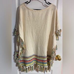 Roxy Knit Serene Morning Fringed High Low Cream Colourful Coastal Poncho Top