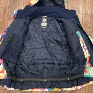 Ski or snowboard jacket with a vibrant multicolor design. Features a removable hood, snow skirt, zippered pockets, zipper and Velcro closure and arm vents.