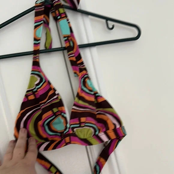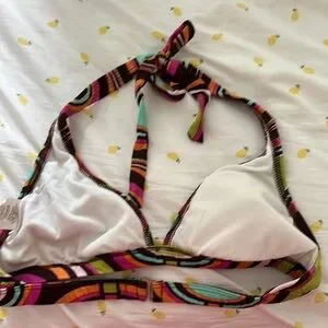 Vibrant Roxy bikini with a bold pattern. Features a halter neck design. Perfect for beach days. Cups are padded.