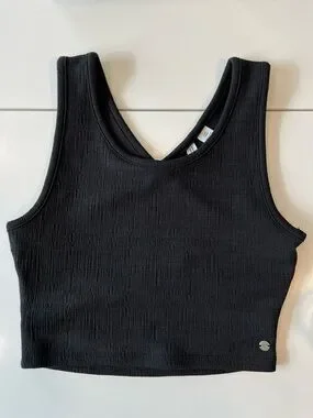 Made of a soft and stretchy knit-blend fabric, this solid crop top elevates a fitted shape with an eye-catching open back and cross-strap detail.