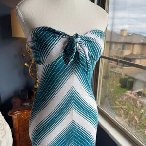 Roxy turquoise and white striped tube dress, size S. Sweetheart neckline with tie up and center of bust, elastic ruching at back. Great used condition. Bust measures 14.15 laying flat, waist 13 inches flat, hips 17 inches, length 53.25. All measure ments except length have some stretch. Cat friendly, non smoking home.