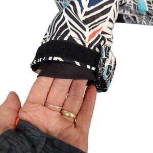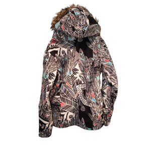 This pre owned jacket has been very well taken care of. Features 10K ROXY DryFlight® technology. A slim cut with a 3-way adjustable hood with removeable faux fur, snap away powder skirt system with jacket-to-pant attachment system, multiple pockets and underarm venting. Mesh lined underarm venting, internal stretch wrist gaiters, cuff with gusset, chin guard.