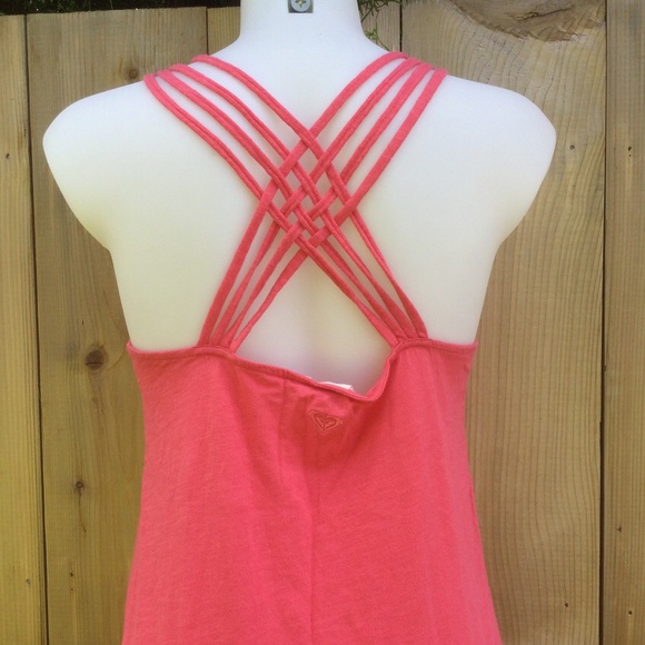 Roxy long maxi dress. Size medium. Ruffle overlay on front neckline. Beautiful multi strap crisscross design on the back.
