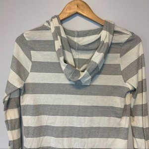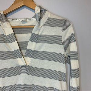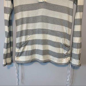 V neckline with hooded back. Ruched with drawstring on both sides.