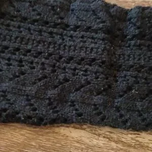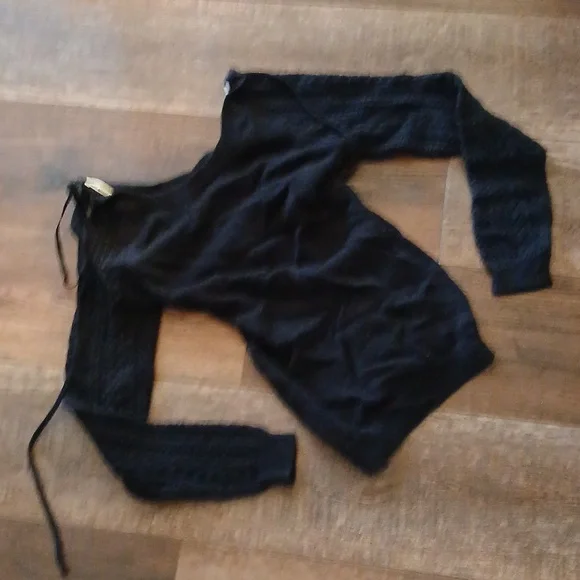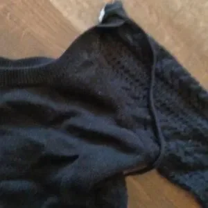 Black knit Roxy sweater with crochet sleeves and scoop neck