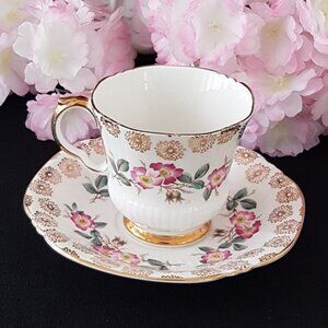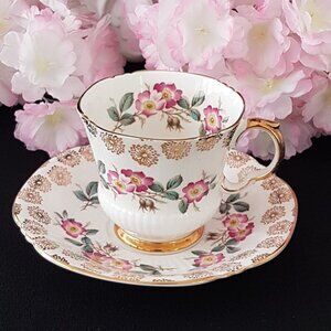 Vintage Royal Adderley (England) bone china tea cup & saucer featuring pink wild roses and floral gold filigree.