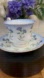 White with cornflower blue gradient, multicolour florals, gold trim.