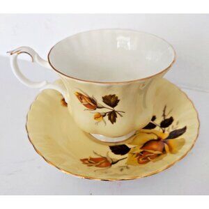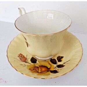 This unnamed teacup and saucer by Royal Albert features a soft butter yellow background with large yellow/brownish red roses.