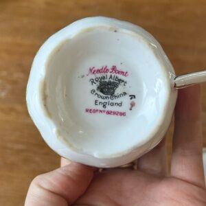 This exquisite Royal Albert tea cup and saucer set is a vintage original from the 1920s. Made in China, this two-piece set features a round shape with a glossy finish and a beautiful needle point pattern in multi-color.