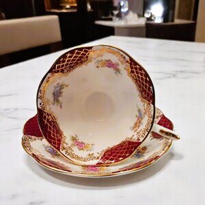 This teacup set is one of four that commemorates the most famous and influential ruling Queens in history. Decorated with small colourful sprays, rich red colour and a touch of gold gilt decoration to add luxury befitting of royalty.