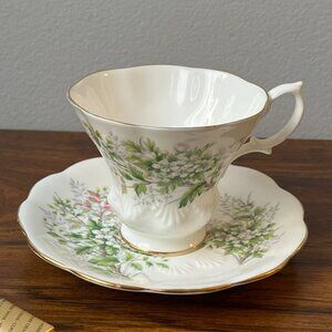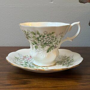 🌸 This is a vintage Royal Albert Friendship Series teacup and saucer in the "Hawthorn" pattern. The set is made of bone china and features a floral design of soft white and pink hawthorn blossoms with green foliage on a white background. The cup has a delicate "Lyric" shape with a gold-footed base and a gold rim. The saucer also has a gold rim. This particular pattern was part of a larger "Friendship Series of 12" produced by Royal Albert from the 1950s to the 1970s.