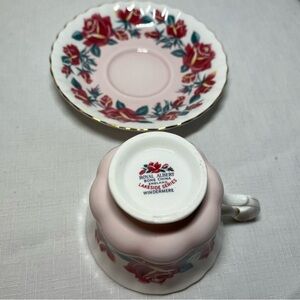 Charming teacup and saucer with vibrant red roses. Delicate pink background. Ideal for tea lovers or collection.