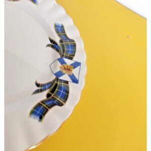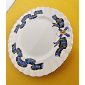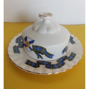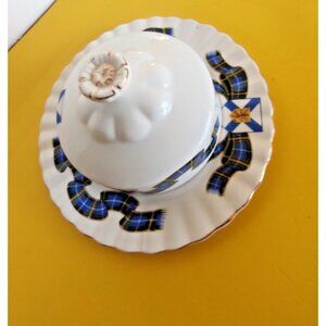beautiful vintage, very hard to find, round bone china butter dish with lid. Made in the 1960s in England by Royal Albert China, it is part of their iconic Nova Scotia Tartan pattern. The pattern features a gorgeous Scottish highland tartan in blue and green, and a majestic lion rampart.