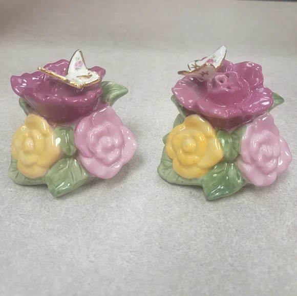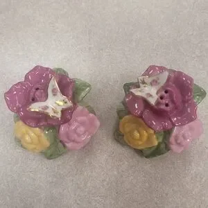 Royal Albert Old Country Roses salt and pepper shakers. 1962. Pink and yellow roses with butterfly in gold trim. No wear to gold, no chips or cracks.