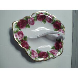 This is a beautiful leaf shaped divided dish with the stem being the handle. It is in the Royal Albert Old English Rose Pattern. This dish is in excellent vintage shape, pre-owned but in much loved condition. Vibrant colors of burgundy and pink roses with gold filigree edges.