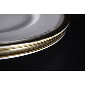 Classic Royal Albert Bone China dinner plate in their Paragon Clarence pattern. This pattern dates from 1987 and is currently discontinued. It has a subtle ribbed design on the wide edge, and a gold and black trim. Made in England, these plates are in good condition with some wear to the gilded edging, although it is such a regular kind of wear, it looks like it is part of the pattern.