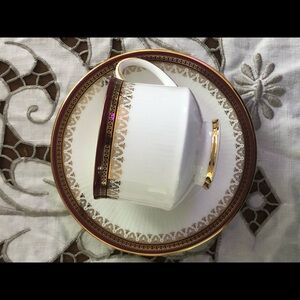 Paragon Holyrood was first introduced in 1987 and became a firm favourite of pottery buyers. Holyrood features on a stunning bone white china in a lovely distinct shape. The gorgeous burgundy border and gold trim pair perfectly with the radial ring pattern surrounding the perimeter of the pottery.