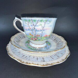 Beautiful Royal Albert “Silver Birch” vintage trio, featuring a teacup, matching saucer, and dessert plate.