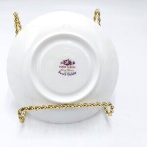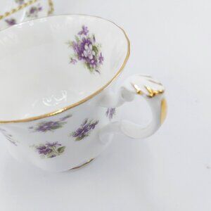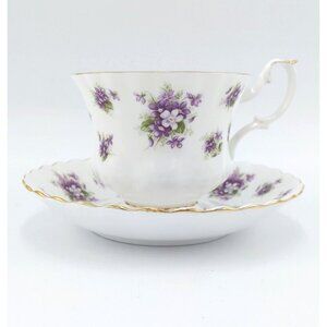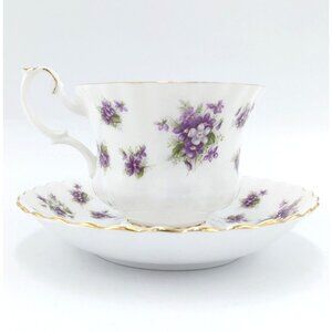 The Royal Albert "Sweet Violets" Tea Cup and Saucer is a collectible set made of fine bone china in England. This pattern, produced from 1966 to 2001, features a delicate and popular design of small purple violets scattered across a white background. The rims of both the cup and saucer are edged in gold trim, which is a classic feature of Royal Albert's elegant dinnerware. The teacup is typically in the "Montrose" shape, known for its graceful curves and classic style. This set is a sought-after piece for collectors of vintage teaware and is often used for special occasions or as a decorative item.