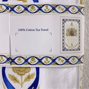 Elegant cotton tea towel featuring a royal crest design. Vibrant gold and blue colors.