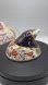 It is an adorable depiction of a garden mole poking its head up in a flower garden, hand decorated with florals and the signature blue and 22kt gold paint details.