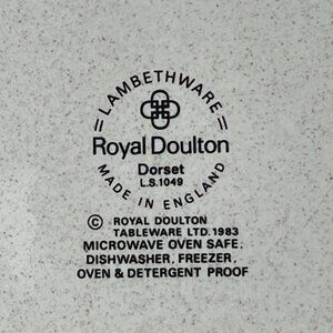 Description 🌸 Three dinner plates by Royal Doulton, England. These plates are from the Lambethware everyday dinnerware series, produced from 1974 to 1992. The "Dorset" print features soft blue wildflowers with brown accents on a creamy mottled background. This pattern is sophisticated yet simple, adding a cozy, rustic feel to the table. Introduced in 1983.