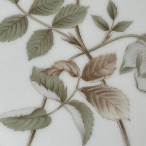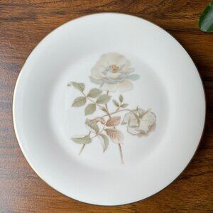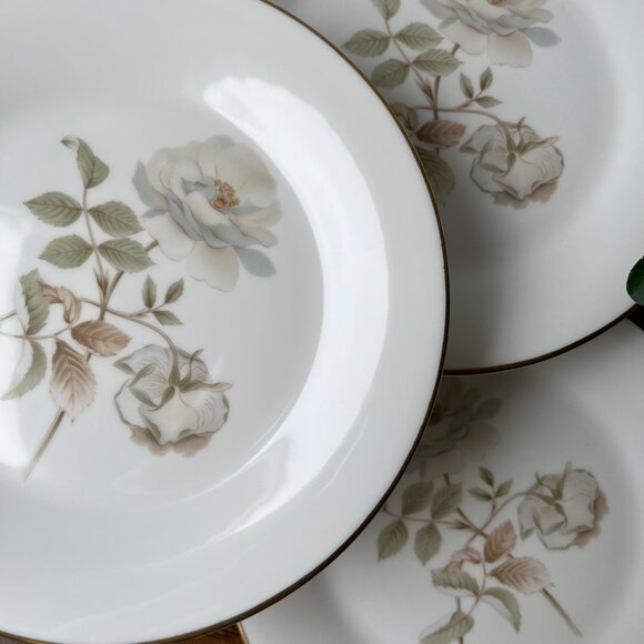 Description 🌷 Three fine bone china salad plates by Royal Doulton, England. "Yorkshire Rose" pattern, No. 5050, in soft, understated tones with a dark gold rim. These plates were produced in 1977.
