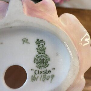 This charming Royal Doulton bone china figurine, titled Cissie (HN1809), was designed in England and features a delicate young woman in a flowing pink dress with a wide lavender bonnet and a basket of vibrant yellow blooms. First issued in the early 1930s, Cissie captures the romantic pastoral style typical of Royal Doulton's early 20th-century production.