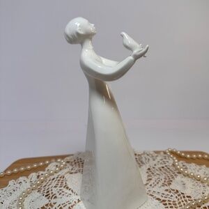 This serene vintage figurine from the Royal Doulton Images Collection depicts a graceful figure gently holding a dove, symbolizing peace, hope, and spiritual calm. Finished in Royal Doulton’s signature glossy white glaze, the minimalist design carries deep emotional meaning while remaining timeless and elegant.