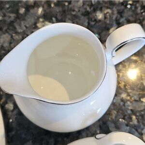 Charming white sugar bowl and creamer set with delicate silver accents. Perfect for tea time or as a decorative piece.