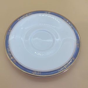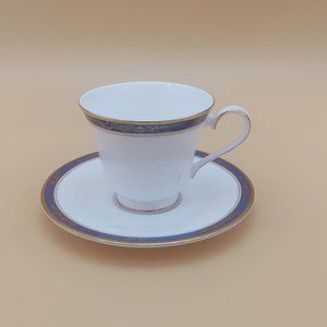 This listing is for a white tea cup & saucer made by Royal Doulton in Staffordshire, England in 1988 as part of their "Cathay" line; the pattern # is H5140. The pair are decorated with gold rims followed by a band of blue with flowers and Chinese styled buildings followed by gold in the form of a castle's parapets. There is no crazing, chips or cracks.