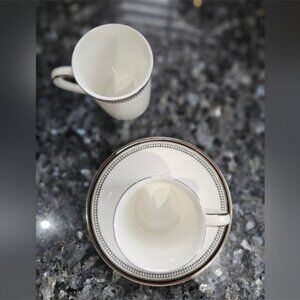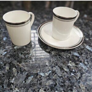 Stylish white mug and saucer set with silver accents. Perfect for any occasion.