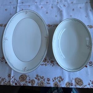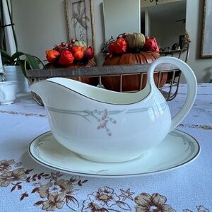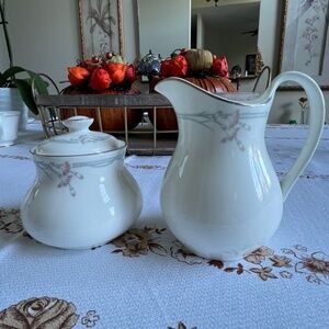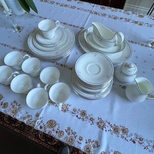 This beautiful fine bone china set is in excellent condition with no wear/chips/cracks. The carnation pattern (#H.5084) was released in 1982. Features white background and delicate pink floral w bluey green stems & platinum rims. The set includes the following: