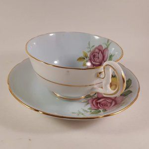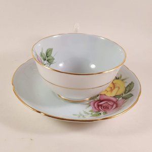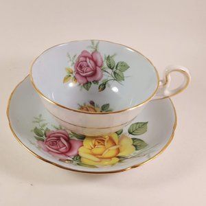 Royal Grafton 1950s Pink and Yellow Roses with blue shade Teacup & saucer