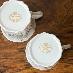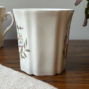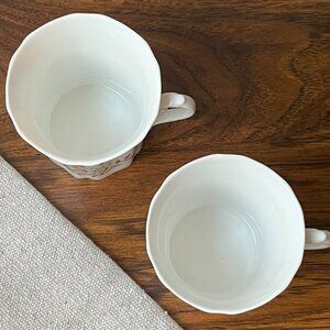 🌸 These mugs are a vintage set of Royal Grafton fine bone china teacups or mugs. They are white and feature a floral pattern with pink and cream flowers, as well as green leaves. The mugs have a ruffled texture on the exterior. The handles are also molded with a decorative, curved design.