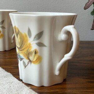 🌸 These mugs are a vintage set of Royal Grafton fine bone china teacups or mugs. They are white and feature a floral pattern with yellow roses, as well as green leaves. The mugs have a ruffled texture on the exterior. The handles are also molded with a decorative, curved design.