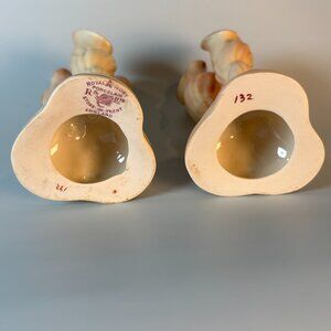 These porcelain sculptures were manufactured by Ridgways (Bedford Works), Ltd., a renowned pottery maker in Stoke-on-Trent, England, during the 1920s to 1940s. The base of one piece is marked with the distinctive "Royal Ivory Porcelain" logo, which includes an elephant head and a decorative star-shaped flower between the words "Royal" and "Ivory." This mark is a testament to the craftsmanship and elegance of early 20th-century English porcelain.