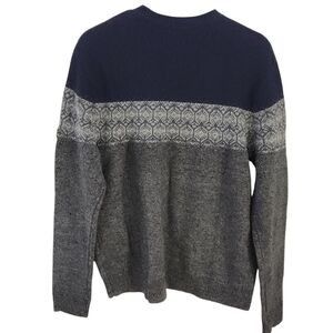Features a classic Nordic / fair isle knit pattern, crew neck, and dark blue and grey tones.