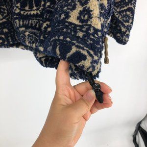 Longsleeve thick and heavy fleece sweater (polyester & acrylic) with a sort of blue abstract / tribal patterning throughout. Neckline goes high up and there is a 1/3 button closure in the front. Two side pockets zip protected, and a drawstring at the hip to adjust the size.
