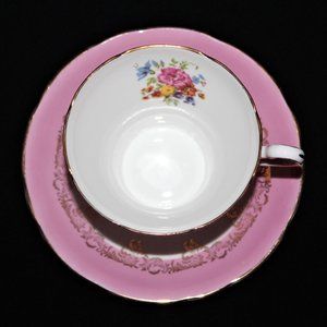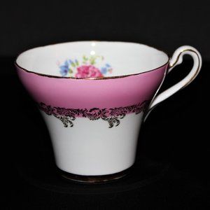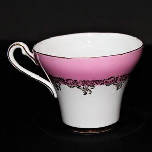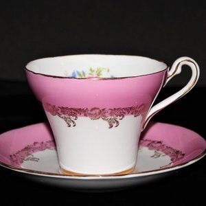Truly an eye catching one-of-a-kind set from Royal Stafford. This Passionate Pink set is adorned with beautiful design elements, such as the floral spray within the cup and in the center of the saucer; the gold gilt along the subtle scalloped rims of the saucer and fluted cup as well as the cup rim, foot, and handle. On both pieces, the pink and white border blends together with the gold scroll overlay.